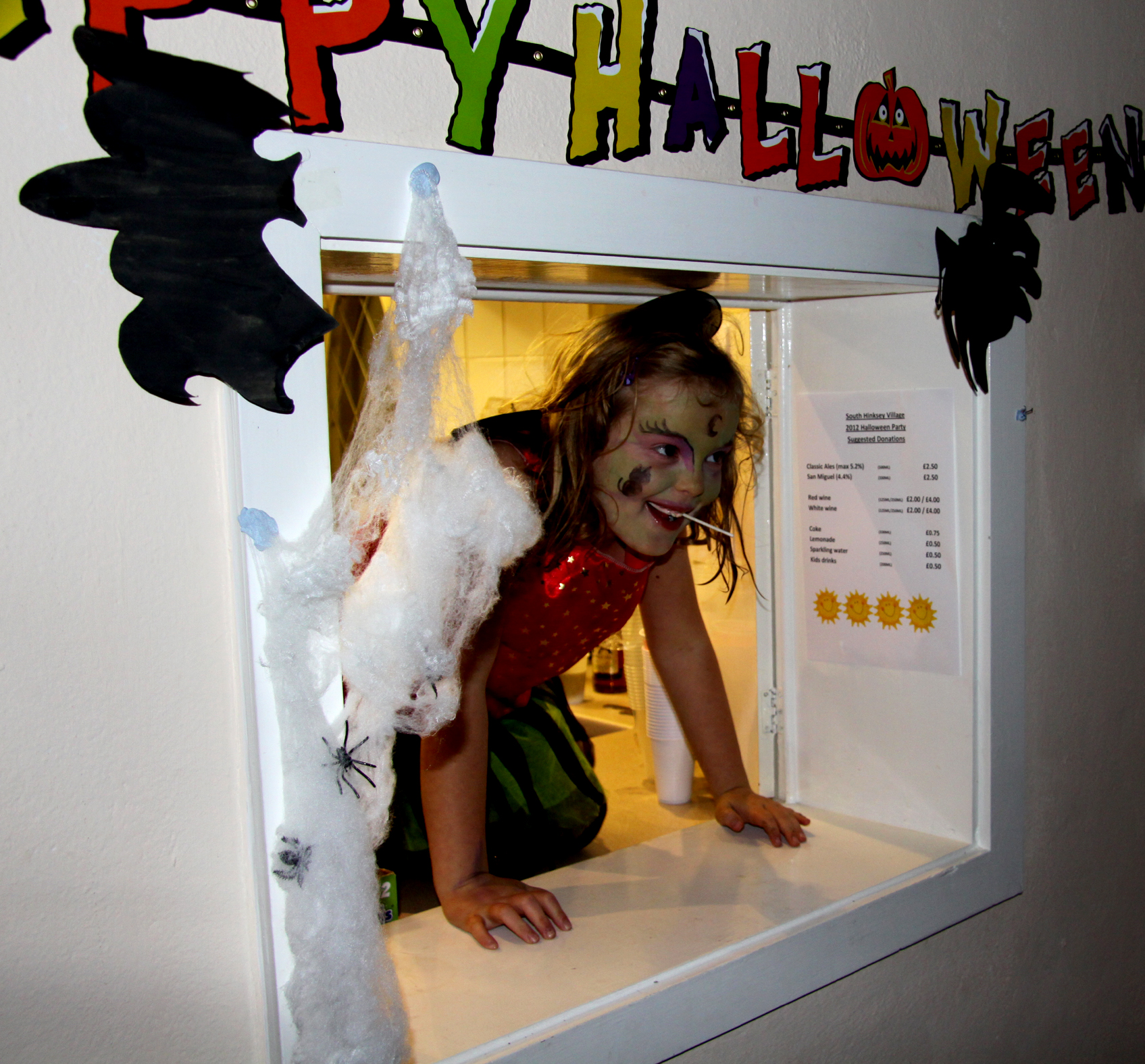Blood painted messages, skeleton images and spiders decorated the walls, while not very friendly looking Jack o’ lanterns stared in shock with their flaming eyes at what was going on in the chamber. Dozens of dressed up kids and their parents, from both Hinkseys, (mostly) not scared at all, but having a great time, surrounded by food, booze and games.